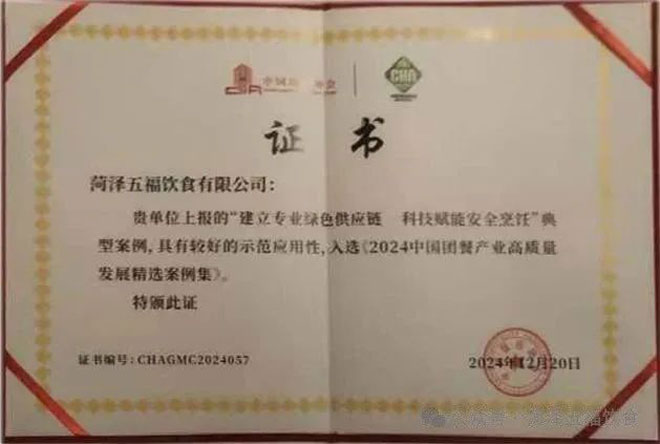 2024年12月,被中國飯店協會授予“2024年度中國團餐領跑...